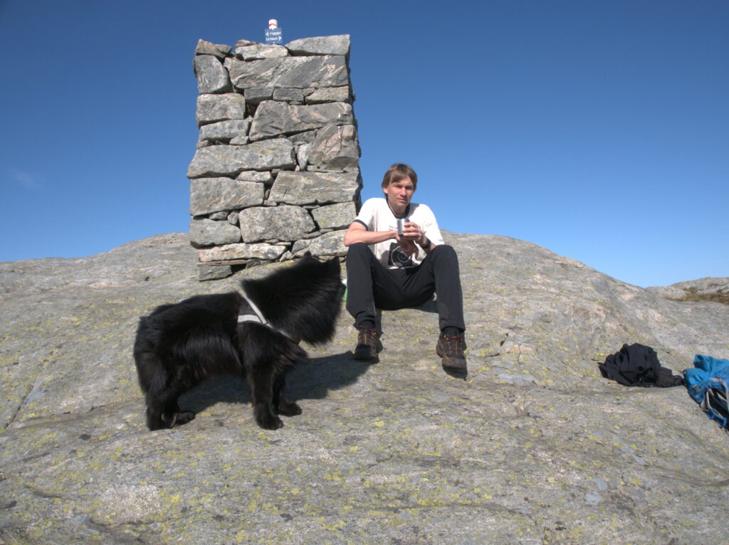 "short_description": "Vegard sits on a rocky mountain top with a black dog, enjoying the view",
